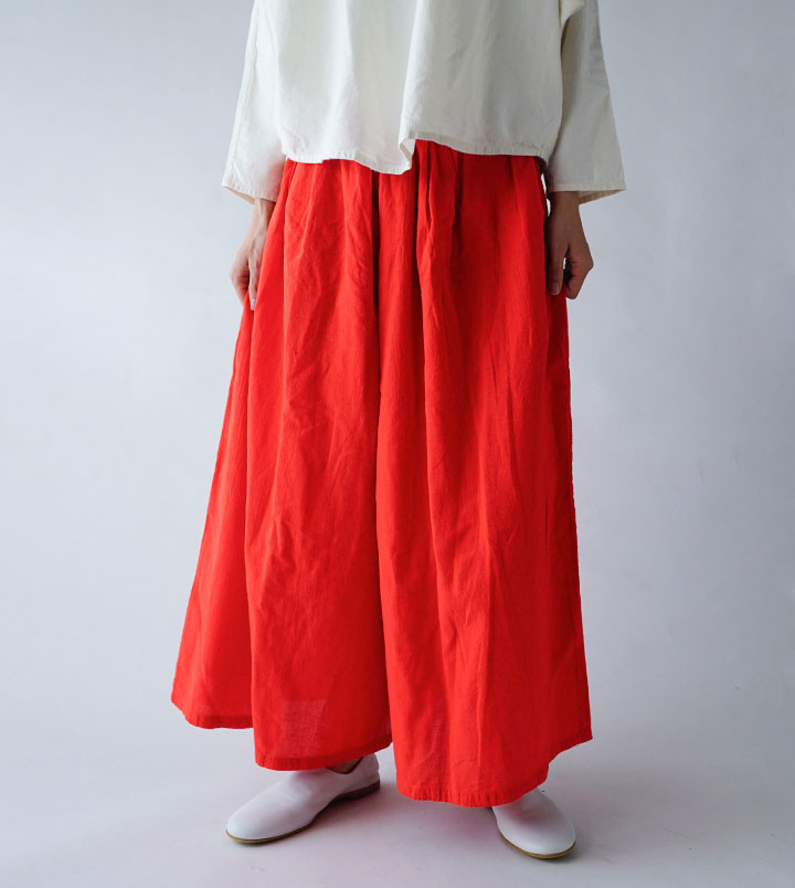 ヂェン先生の日常服のなかでも一番人気のワイドパンツ夏にぴったりの薄手タイプです。なんといってもこのたっぷり感が人気の理由。足のシルエットをひろわないし、とにかく楽ちん。汗でべたべたまとわりつくこともありません。綿麻の生地でいつもさらさら。