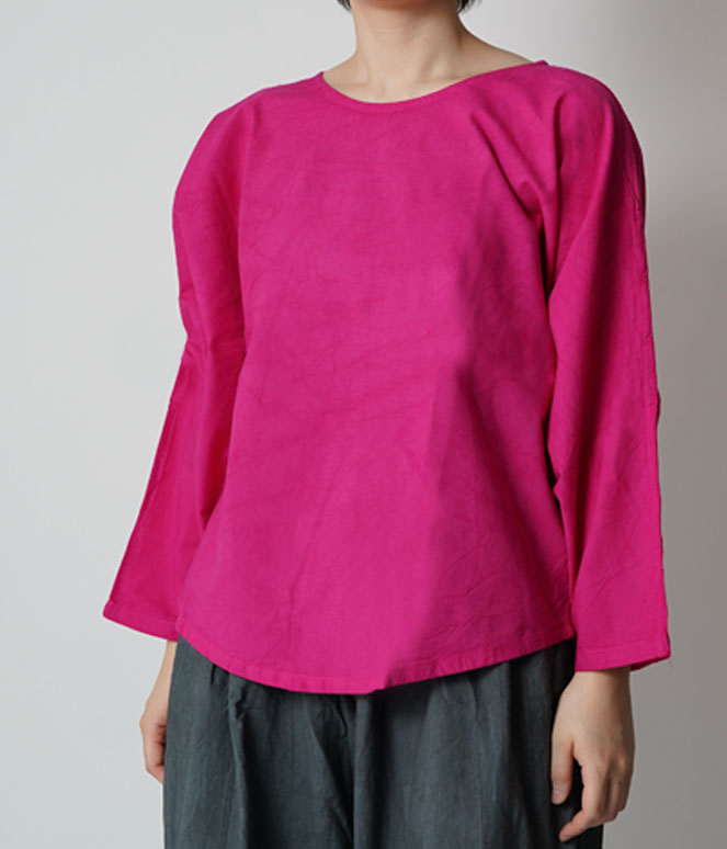ヂェン先生のドルマンスリーブブラウスは、ざくっとかぶって着るタイプ。カッターシャツのようなすこしつるっとした綿素材です。